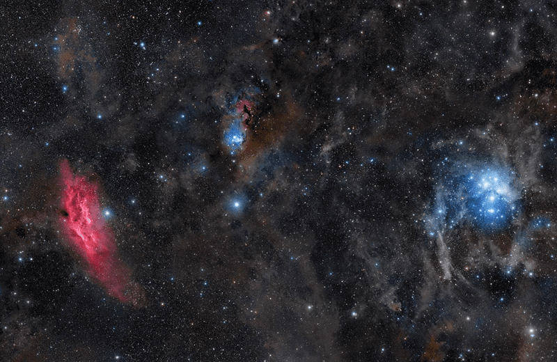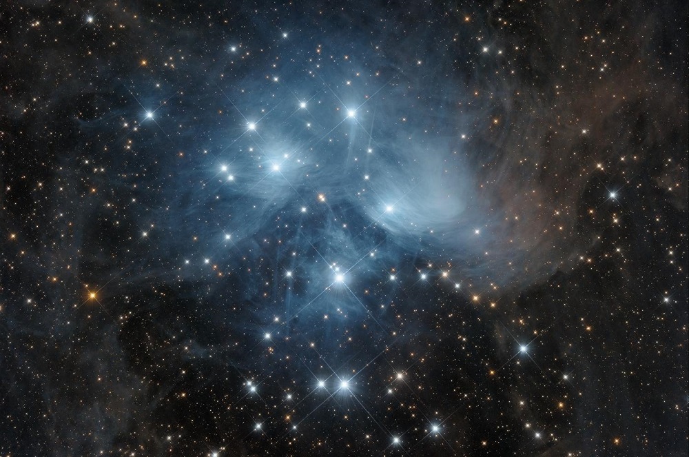 این ستارگان از میان سحابیهای بازتابی دیده میشوند که نور آنها را منعکس میکنند و باعث ایجاد درخشش آبیرنگ اسرارآمیز در اطراف خوشه میشوند.